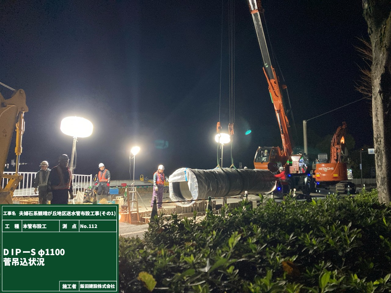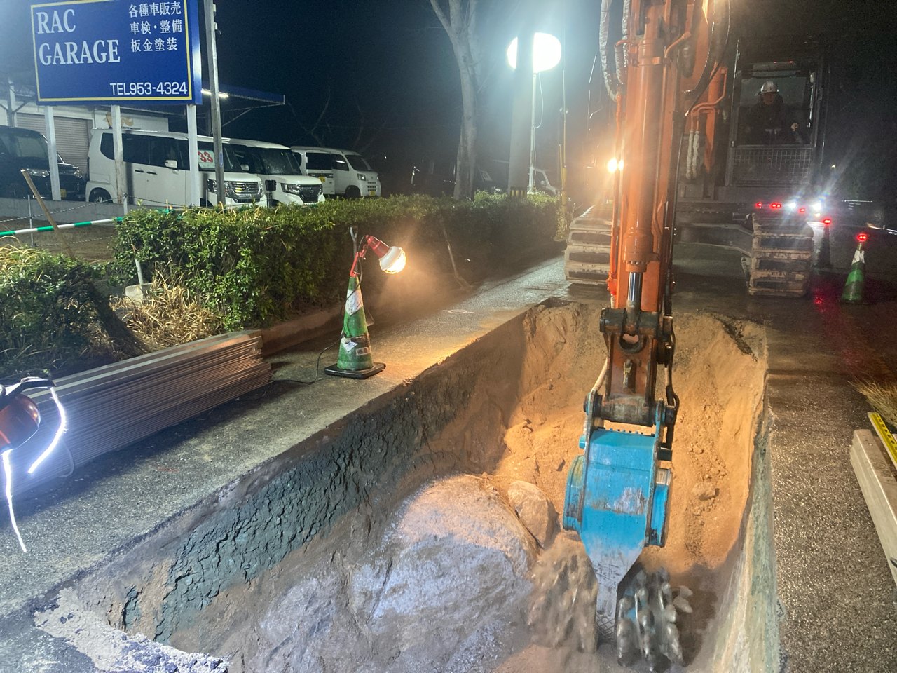| 概要 | 本管布設工(ダクタイル鋳鉄管Φ1100㎜ 延長274m) 本管土工(管掘削土量2,889m3) 付帯工(本復旧工 1176m2、区画線工) 覆工板設置撤去工、ライナープレート土工、土留工 |